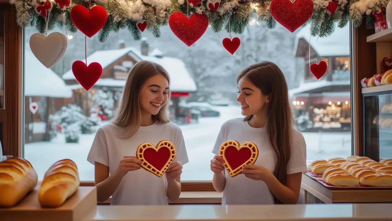 Create charming Valentine's Day visuals with AI: two women in white tees serve heart-shaped waffles in a festive bakery adorned with winter decor. Cozy shop features baguettes, valentine motifs, and a snowscape view through the window—perfect for seasonal branding, social content, or AI-generated romantic scenes.