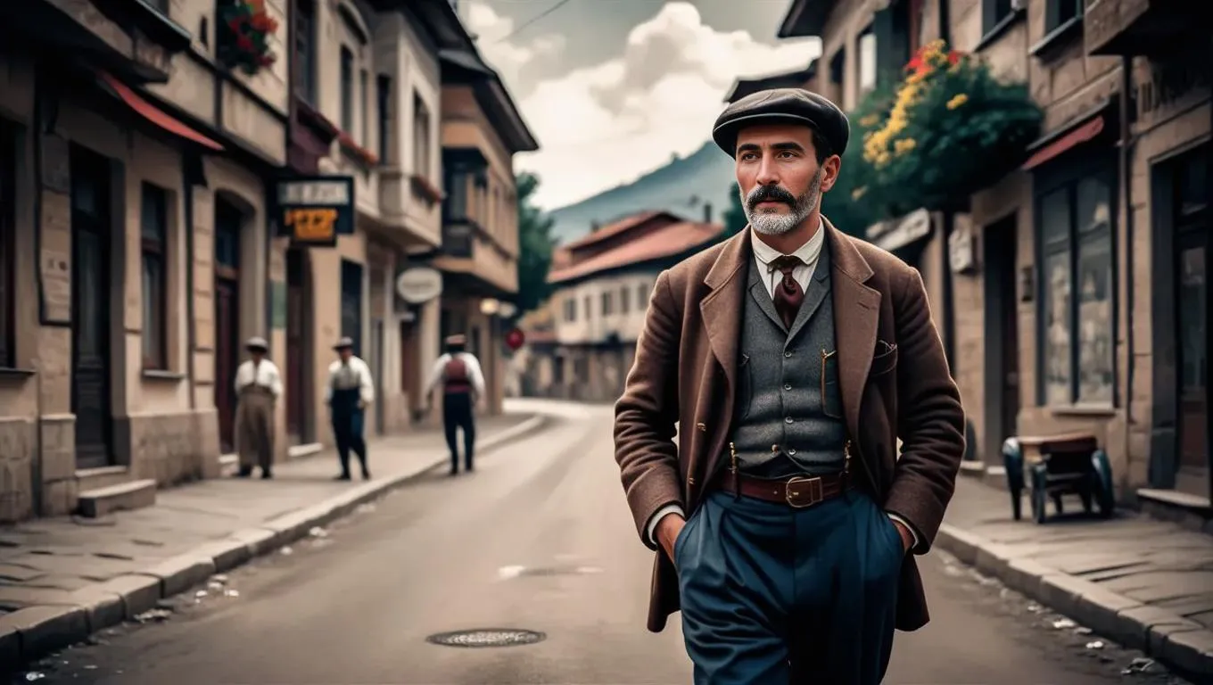 Hyperrealistic AI-generated image of a 1920s man in Bitola, Macedonia. Detailed close-up captures vintage attire on Shirok Sokak Street, blending historical accuracy with lifelike precision. Transform text prompts into professional visual content using advanced AI tools for immersive, era-specific scenes.