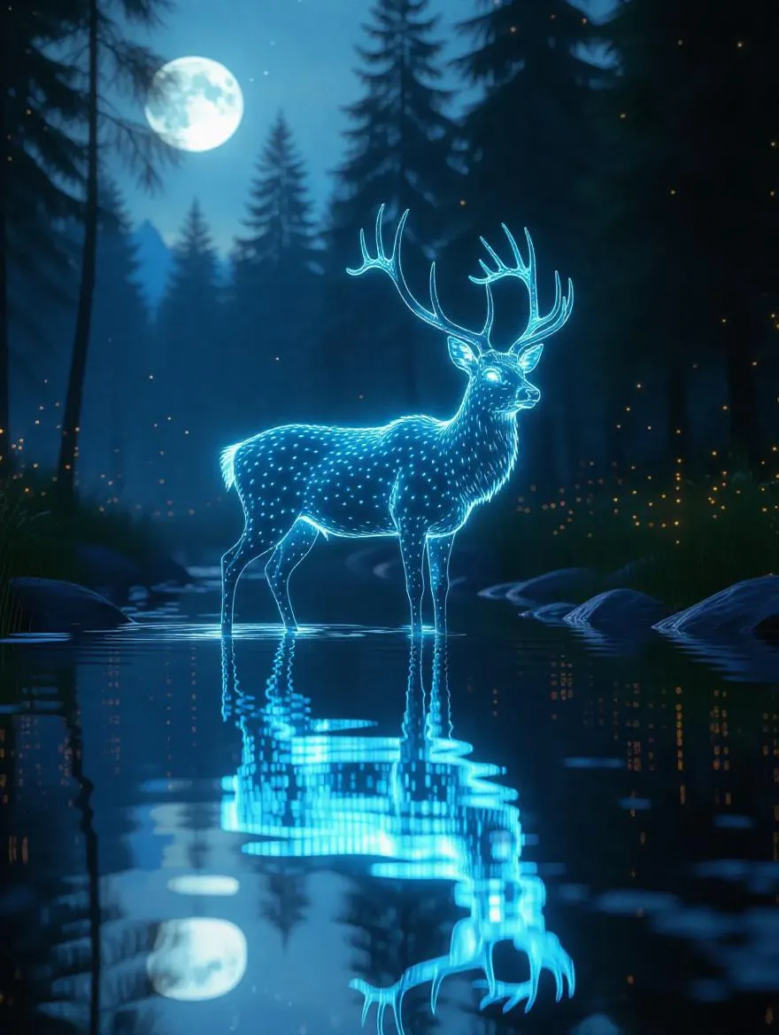 Experience a breathtaking luminous stag with stars in antlers, standing in a moonlit lake amid tranquil forests and dancing fireflies. Inspired by Thomas Kinkade's ethereal fantasy fused with hyperdetailed mist for wonder-filled 8K art. Trending on Artstation – create magic with VivaGO.ai's AI image generator.