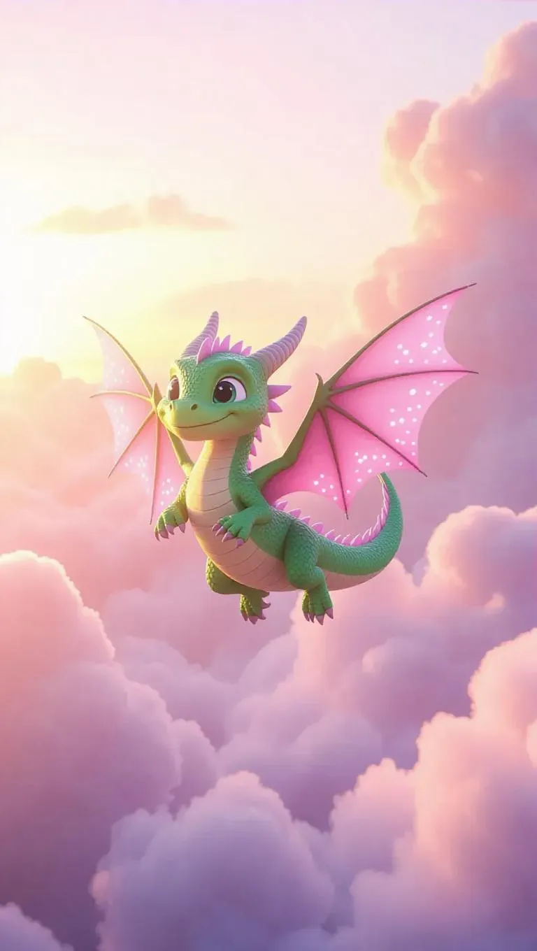 High above the world, a friendly green dragon with delicate pink butterfly-like wings soars gracefully. Sunbeams pierce lavender clouds, casting a warm golden glow around the dragon’s playful form. Big, bright eyes and a gentle smile adorn its face as it dances through the dreamy sky, spreading wonder and joy. Soft, rounded shapes and pastel colors evoke a whimsical, storybook atmosphere.