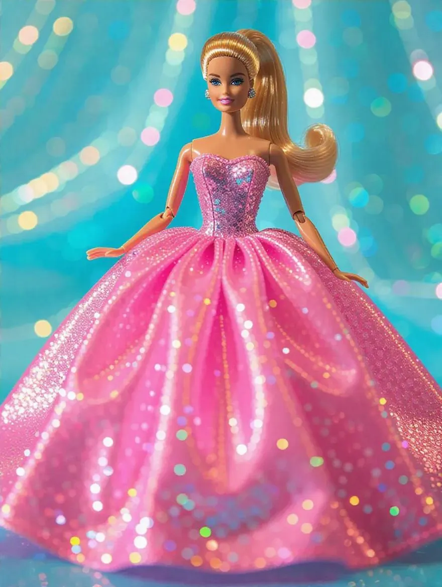 Create stunning 1980s Barbie doll photography. Generate nostalgic Barbie images with beautiful pink ballgowns, vintage lighting, and true 80s retro aesthetics using AI effects. Capture the iconic shiny dress charm.