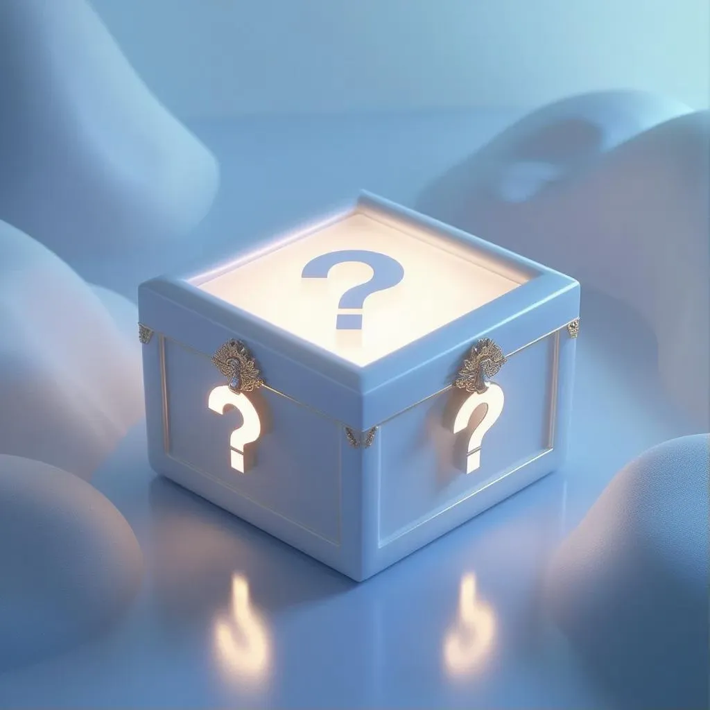 Generate a mysterious unopened 3D blind box treasure chest with pure white color and prominent question mark design using AI. Create captivating mystery box visuals with Vivago.ai's professional-grade tools for digital surprises, blind box packaging concepts, and creative 3D renderings. Customize textures, lighting, and shadow effects effortlessly.
