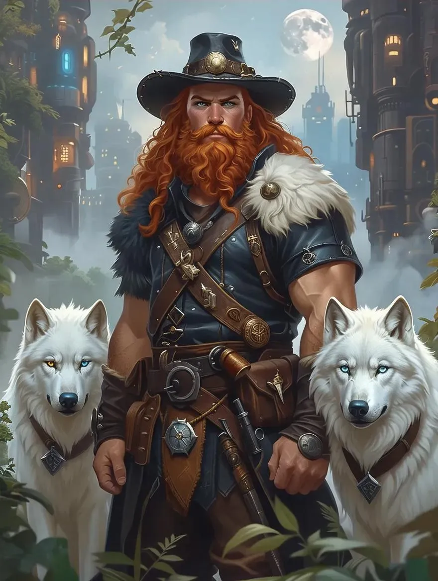 Vivid AI-generated art of a rugged dwarf ranger in a sleek black armored trenchcoat, accompanied by majestic white dire wolves with ice-blue eyes, exploring a gritty steampunk metropolis. Cobblestone streets overgrown with moss, steam-powered machinery, and ethereal moonlight create an immersive atmosphere. Perfect for fantasy storytelling visuals, blending mystical wilderness with industrial intrigue in full-body detail.