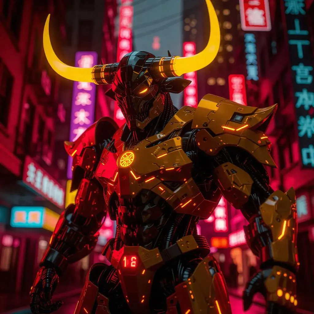 Generate vibrant neon cyberpunk Bull Demon art with a tan-yellow and red palette using AI. Vivago.ai crafts edgy, high-contrast visuals from text prompts, perfect for futuristic themes. Create dynamic, dystopian characters and scenes effortlessly with professional-grade AI image generation tools.