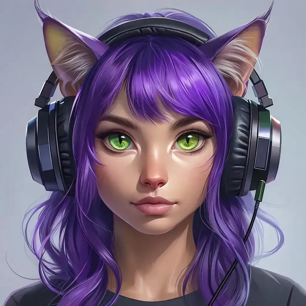 Generate a whimsical AI image of a futuristic cat with dual tails, vibrant purple fur, and striking green eyes wearing a techy headset. Explore endless creative possibilities with vivago.ai's advanced AI tools for surreal, customizable digital art and professional visual enhancements.