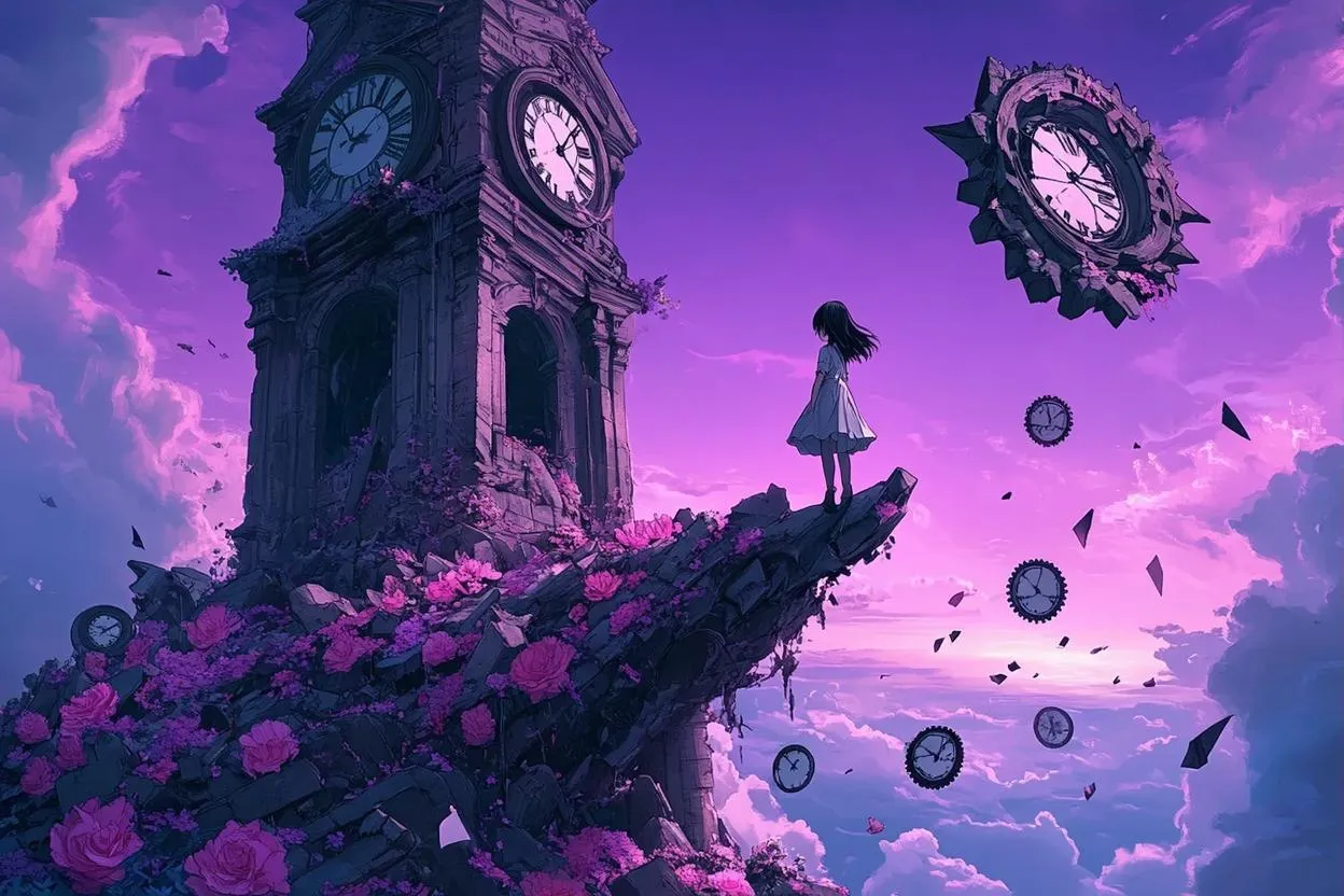 Create stunning AI-generated anime art with vivago.ai. Explore a surreal sky island where time stands still—broken clocks, scattered gears like flowers, and a paper bird atop a violet-hued Gothic bell tower. Perfect for Gothic-fantasy lovers seeking intricate architectural details and timeless, ethereal visuals.
