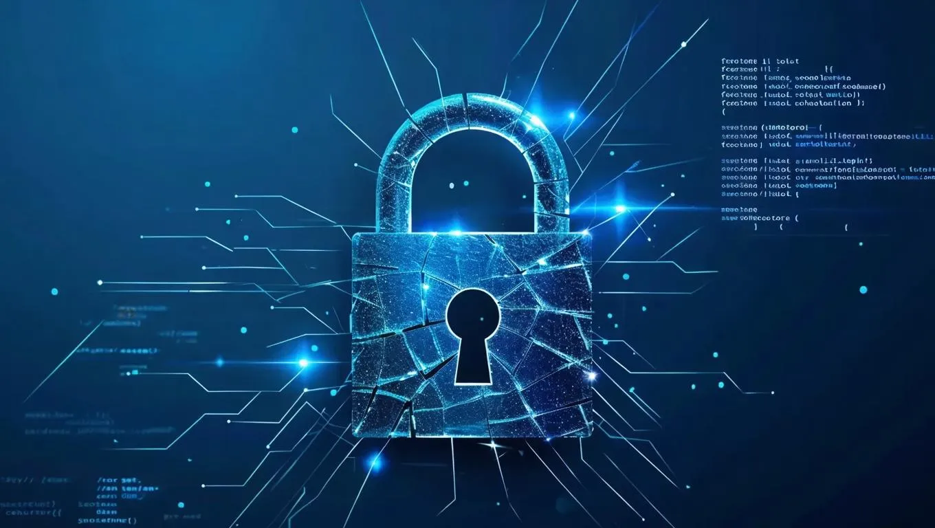 Enhance cybersecurity themes with a dark blue tech background featuring a broken lock symbolizing vulnerabilities. VIVAGO.ai's AI tools generate professional network security visuals, blending code elements and futuristic designs. Create impactful content highlighting digital protection and vulnerability awareness effortlessly.