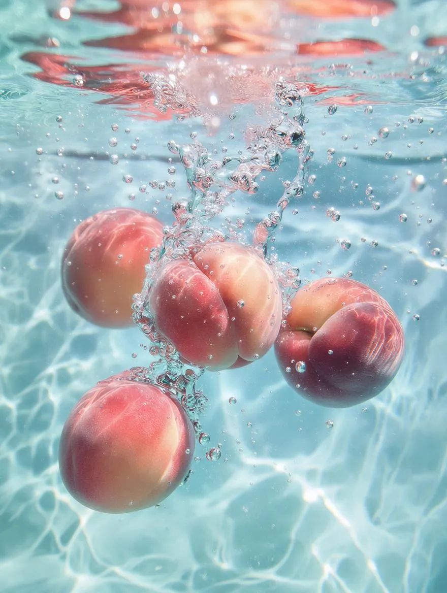 Create stunning AI-generated images with hyper-realistic underwater peaches splashing in crystal water. Features ultra-detailed textures, peach blossom hues, dynamic mint-blue bubbles & gloss reflections. Experience surreal liquid effects via high-speed capture, close-up macro shots & 8K photorealistic cinematic quality. Vivago.ai crafts your vision.