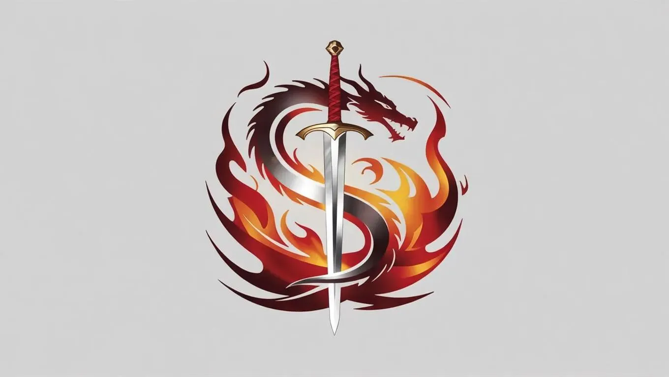 Craft a bold minimalist logo with a sleek sword and majestic dragon entwined in dynamic flames. This modern design combines metallic hues, fiery reds, and clean lines to symbolize power and energy. Ideal for branding seeking strength, intensity, and visual impact through AI-generated symbolic artistry.