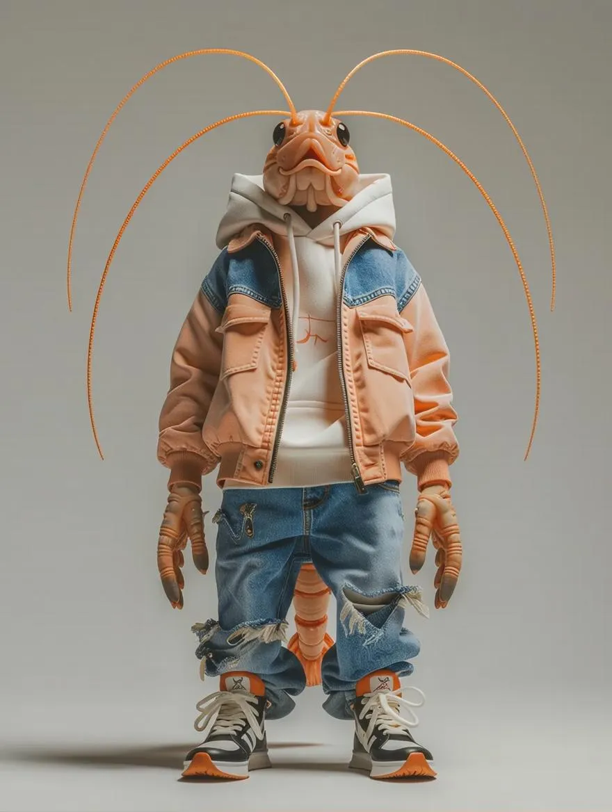 Anthropomorphic shrimp standing on two legs wearing streetwear clothes, full-length head-to-toe shot, neutral background. Hyperrealistic style