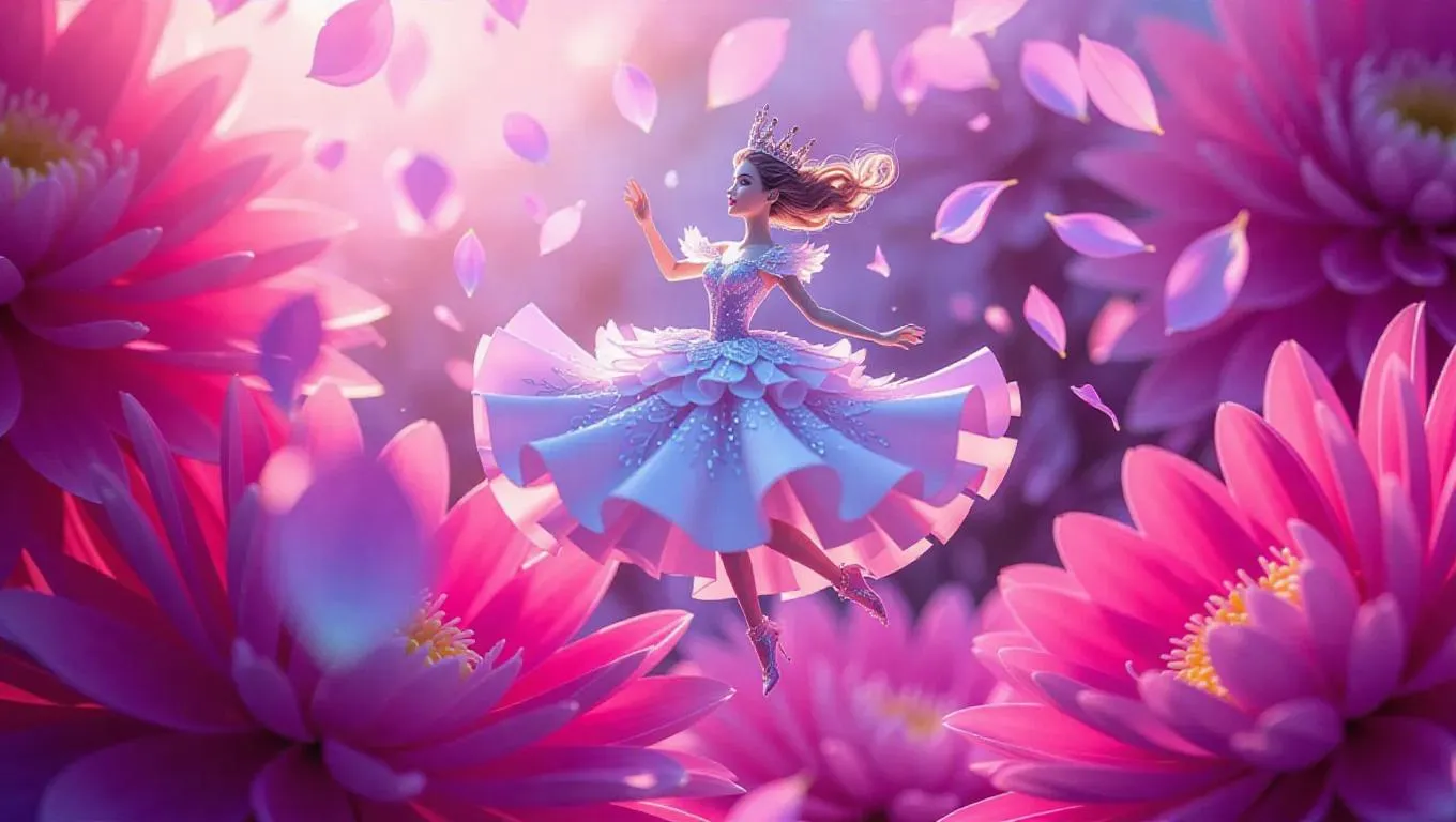 A diminutive, yet majestic, miniaturized queen of flowers leaps between petals of vibrant, sprawling blooms, her delicate, porcelain-like skin and intricately designed, ethereal gown fluttering as she twirls, surrounded by a whirlwind of iridescent, shimmering petals, against a soft, diffused, natural light that highlights the lush, velvety textures of the flowers and the queen's delicate features, in a whimsical, fantastical, hyper-realistic, dreamlike scene.