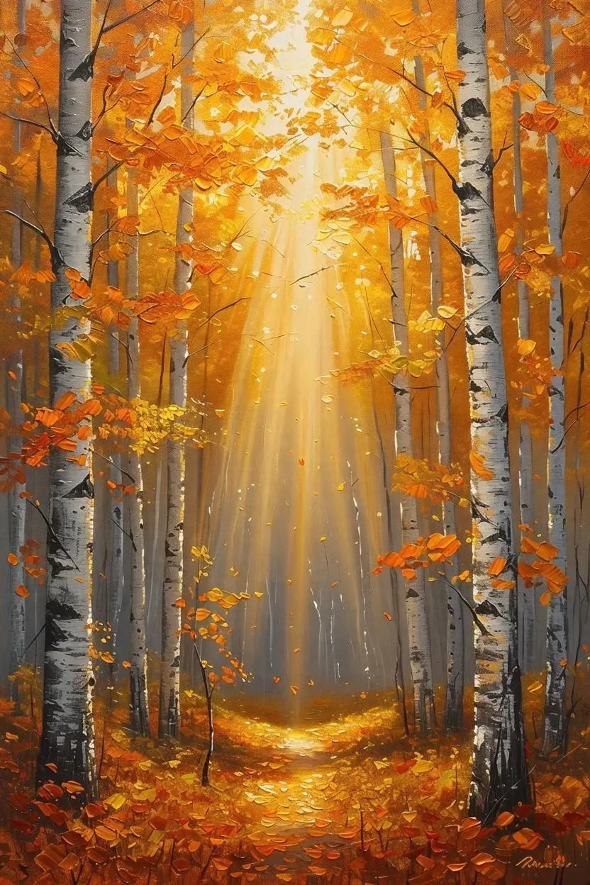 Vibrant AI-generated acrylic painting of an autumn birch forest with golden sunlight filtering through orange leaves. Transform text prompts into serene seasonal art using vivago.ai's AI tools for professional-grade visuals, capturing intricate details and a tranquil atmosphere.