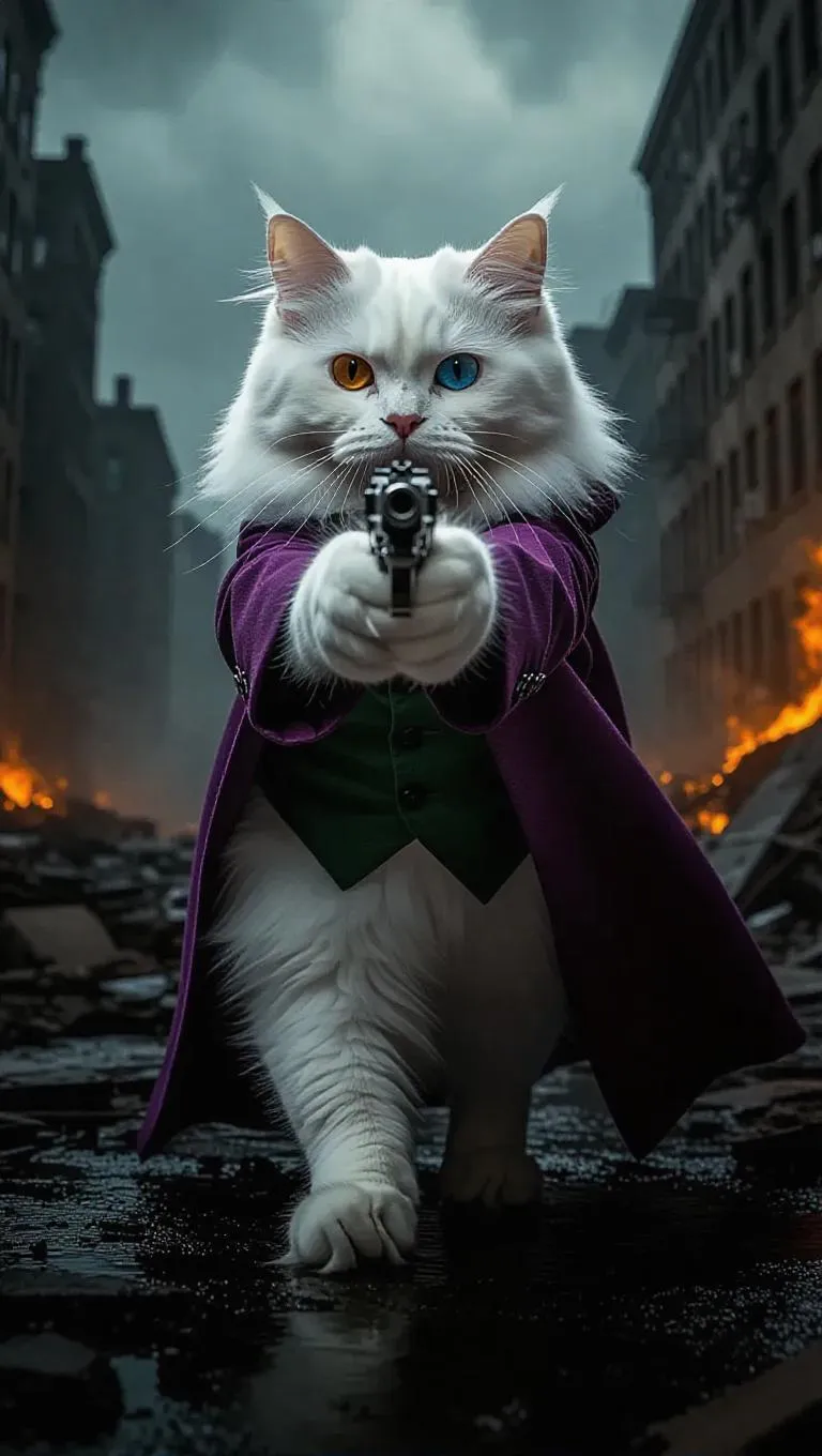Create a vivid AI image of a white Persian cat dressed as Batman's Joker, standing on hind legs, holding a silver gun in an apocalyptic city. Ultra HD, hyper-detailed with heterochromatic orange and blue eyes. Transform text prompts into professional visuals using advanced AI effects and editing tools for striking, high-quality creative projects.