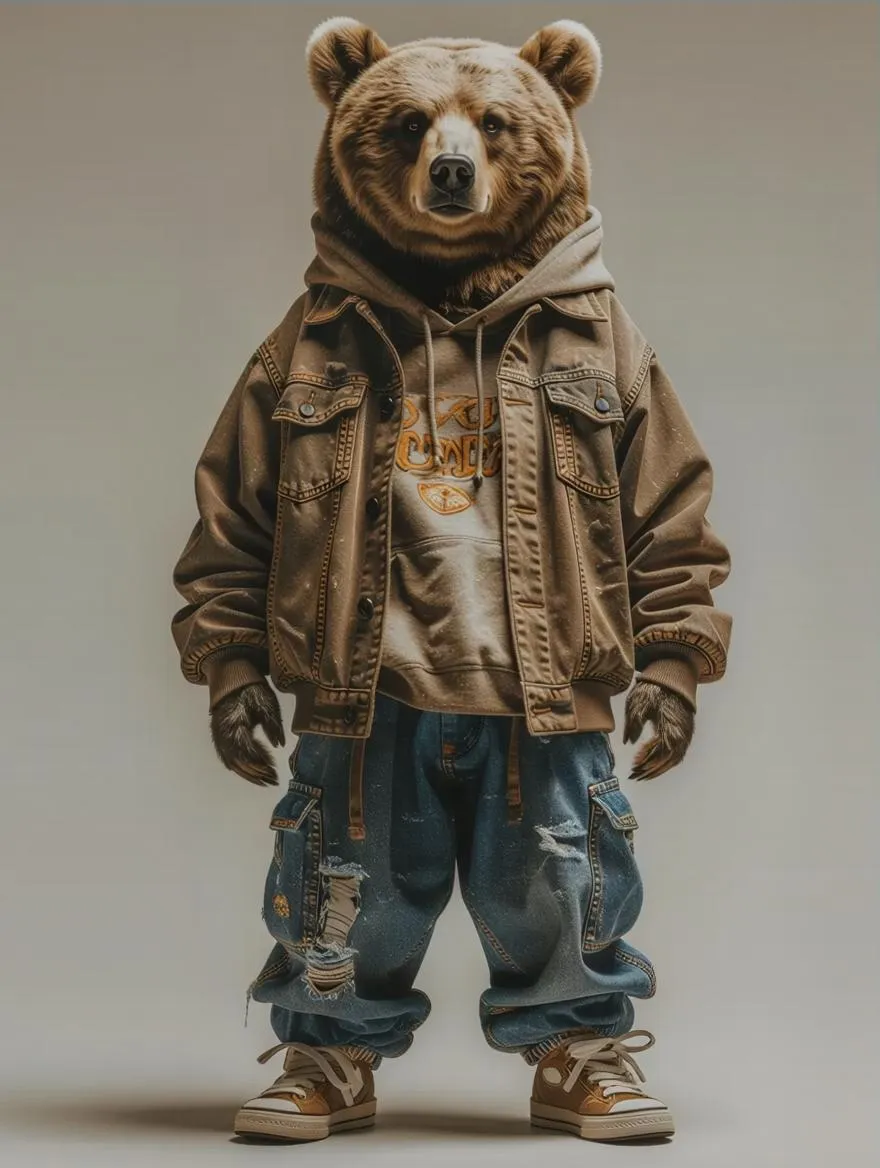 Generate hyperrealistic anthropomorphic bear images in streetwear standing upright. AI-powered full-body shots with neutral backgrounds. Create vivid, professional anthropomorphic animal art instantly using vivago.ai's AI image tools and effects.