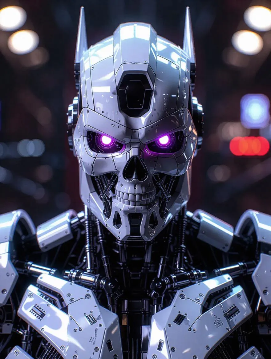 Visualize Abaddon from Skynet Cyberdyne Systems using white, purple, and brown-red color palettes. Create iconic dystopian AI art with our AI image generator. Perfect for dark sci-fi themes and futuristic visuals.