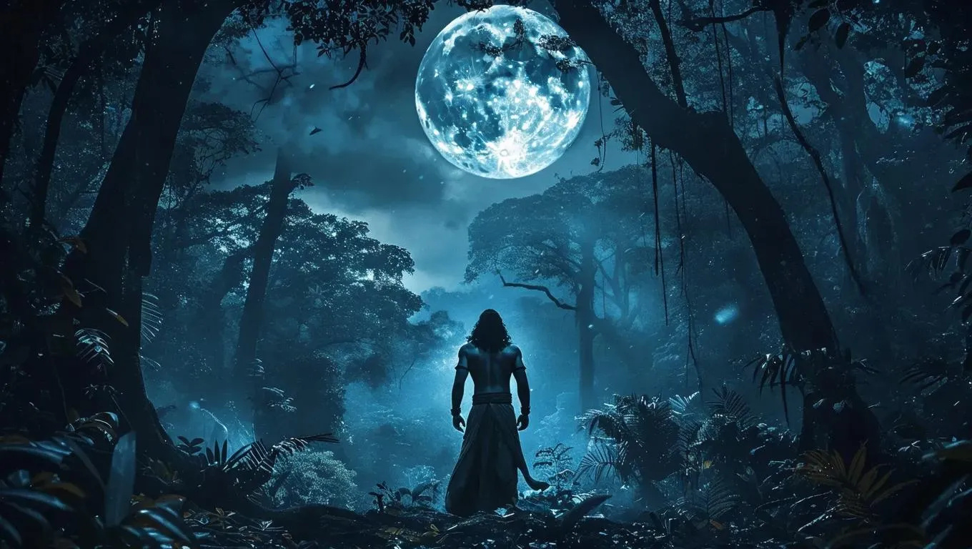 Generate an eerie AI image of a dark jungle scene with a mysterious shadow emerging from a banyan tree, staring at Vikramaditya. Featuring glowing eyes and a suspenseful atmosphere, perfect for horror-themed projects and supernatural storytelling.