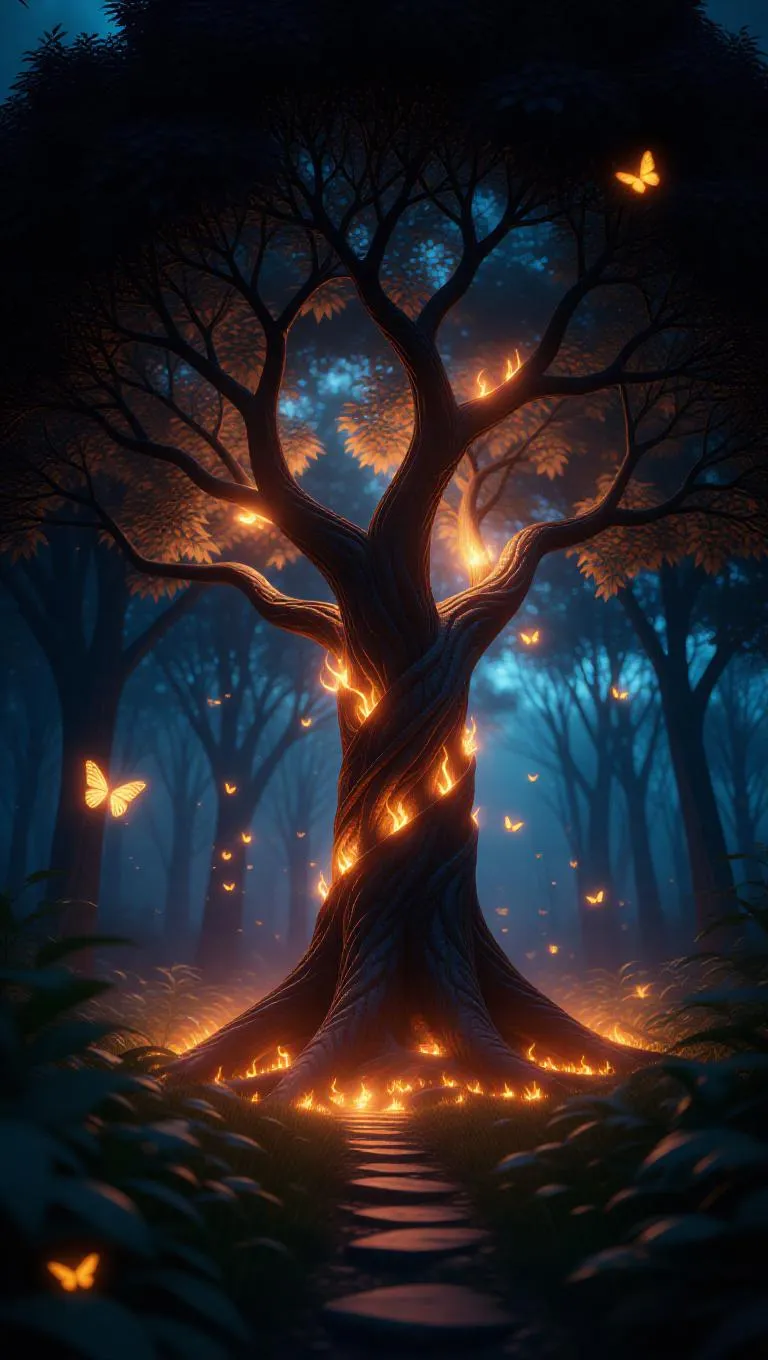 Explore an AI-generated mystical fire forest where ancient trees breathe glowing embers. Bioluminescent flames flicker on leaves, flame-flowers bloom, and ash creatures roam. Immerse in magical realism with rhythmic heartbeats, twilight warmth, and painterly textures. Transform your vision into vibrant fantasy with vivago.ai's AI creative tools.