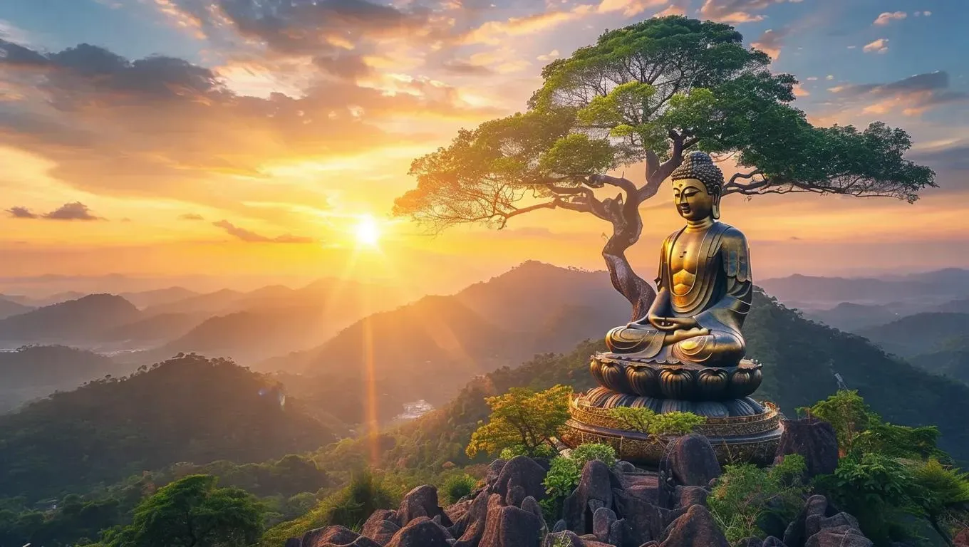 Generate serene AI art of Buddha meditating in lotus pose atop a misty mountain peak beside a solitary tree. VivaGo.ai transforms spiritual prompts into tranquil visuals with lifelike details, ethereal landscapes, and mindful atmospheres using advanced AI image generation tools.