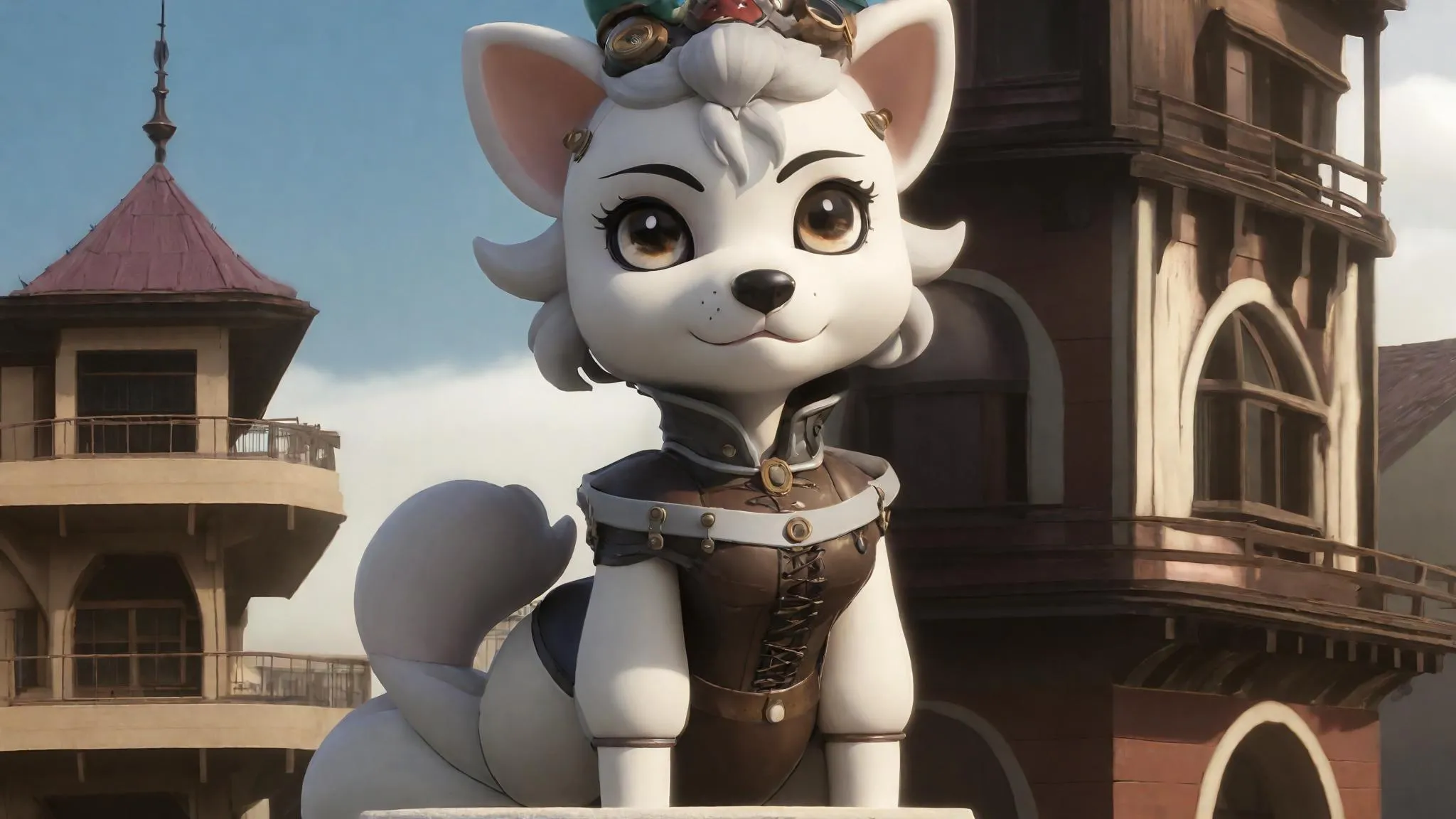 Anime beauty, medium shot, low angle, three-quarter view, manga style. Steampunk cityscape with gears and flying airships. Leans against a rusty pipe, one leg crossed, almond-shaped deep sapphire eyes wink playfully. Luscious cherry lips slightly pursed. Hourglass figure in a corseted leather top with exposed midriff, short frilly skirt of weathered canvas. Fiery red hair in loose curls bouncing with movement.