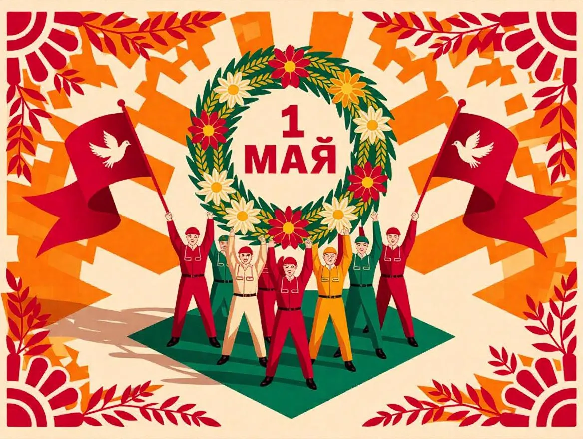 Create vibrant retro May Day greeting cards with AI. Bold geometric shapes, warm gradients, and a central worker ensemble holding a floral wreath. Gold-foil "1 Мая" typography meets industrial-botanical linocut textures. Soft halation, metallic accents, and dove peace symbols. Customizable text area framed by socialist realist motifs in burnt orange/cream. Isometric depth with dramatic shadows for professional-grade designs.