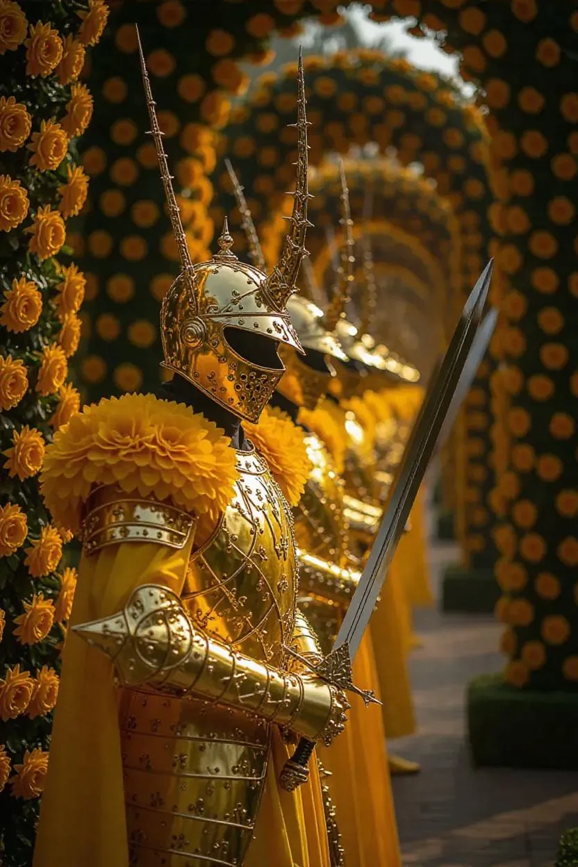 Generate striking AI art of guards clad in vibrant yellow floral armor with thorny details, wielding sharp botanical swords. Transform text prompts into surreal, nature-inspired warriors using Vivago.ai's AI image tools for fantasy visuals, unique character designs, and creative projects with vivid, imaginative details.