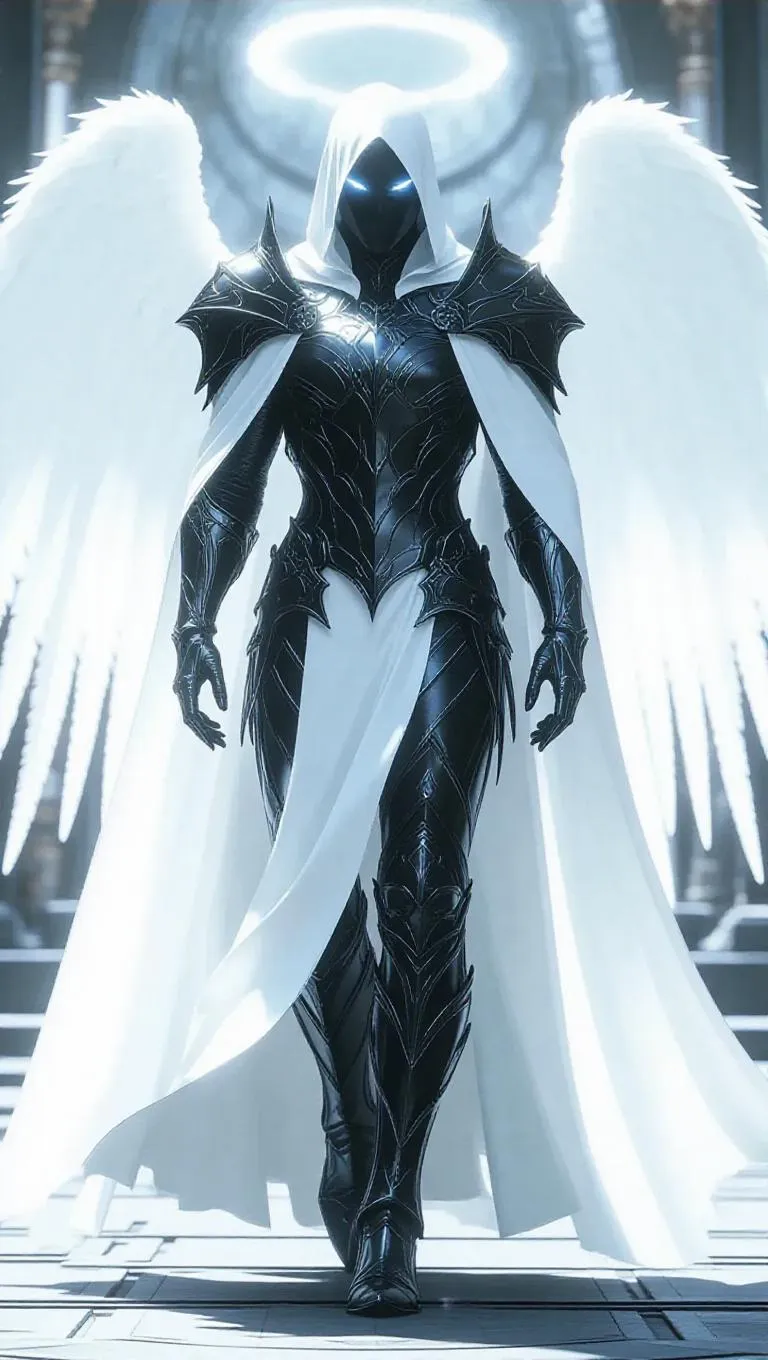 Generate stunning AI art of Samael, a majestic figure in silver-black armor etched with ancient laws. His white shadow robe flows behind a cold flame halo, black wings outstretched, silver eyes gazing into destiny. Hyper-realistic 4K resolution captures serene heavenly vibes with a quiet undercurrent of fate. Explore divine AI effects at vivago.ai for professional-grade visuals.