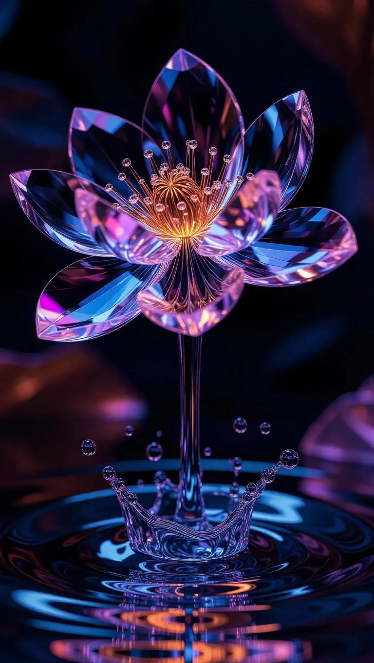 Create hyper-realistic AI-generated art with a crystal flower structure showcasing dynamic water flow, blending Fauvist vibrancy and surrealism. Inspired by Brummbaer, M.C. Escher, and Ernst Fuchs, Vivago.ai transforms text prompts into vivid visuals using advanced AI tools for professional-grade, imaginative results.
