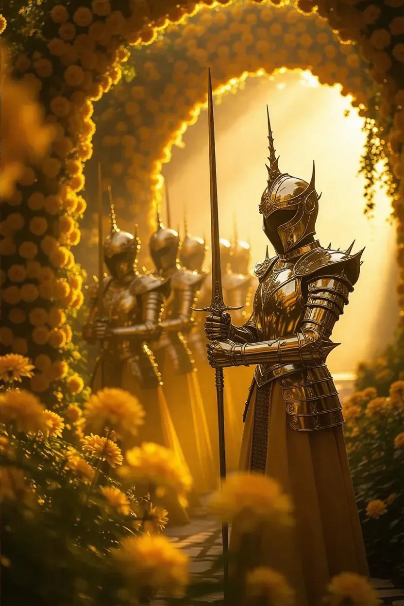 Generate striking AI art of guards clad in vibrant yellow floral armor with thorny details, wielding sharp botanical swords. Transform text prompts into surreal, nature-inspired warriors using Vivago.ai's AI image tools for fantasy visuals, unique character designs, and creative projects with vivid, imaginative details.