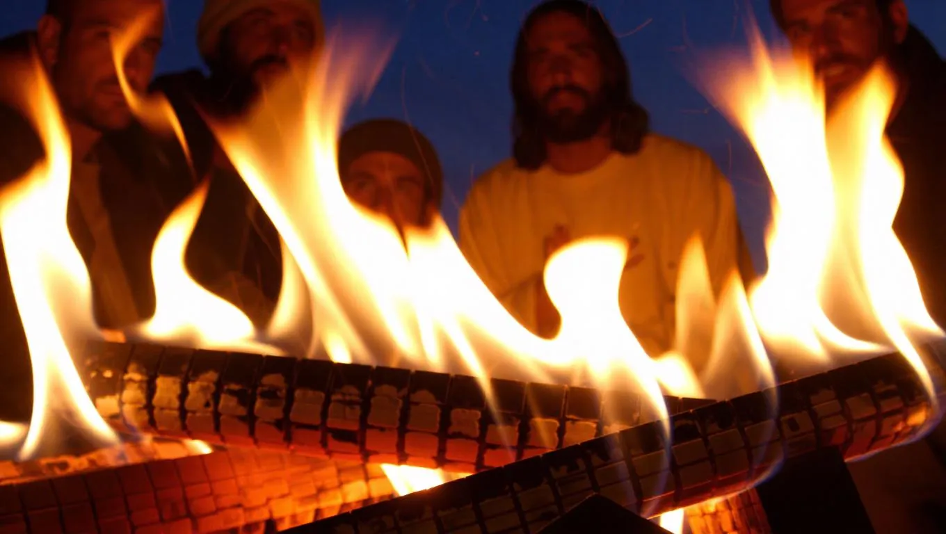 Create AI-generated religious art with vivid Bible scene visuals. Depict Jesus & disciples around a campfire, illuminated by flickering flames as fish cooks. Perfect for spiritual storytelling, historical biblical imagery, or faith-based AI art projects. Elevate sermons, content, or personal reflection with AI-powered sacred scene creation.