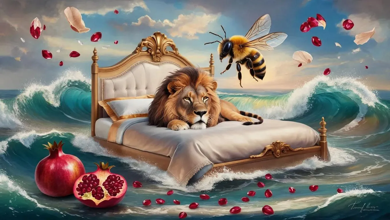 Experience a surreal dreamscape with AI-generated imagery of a floating bed on tranquil seas, a slumbering lion, shattered pomegranate, and a giant bee. Transform text prompts into fantastical visuals using Vivago.ai's advanced AI tools for creative, professional-grade art.