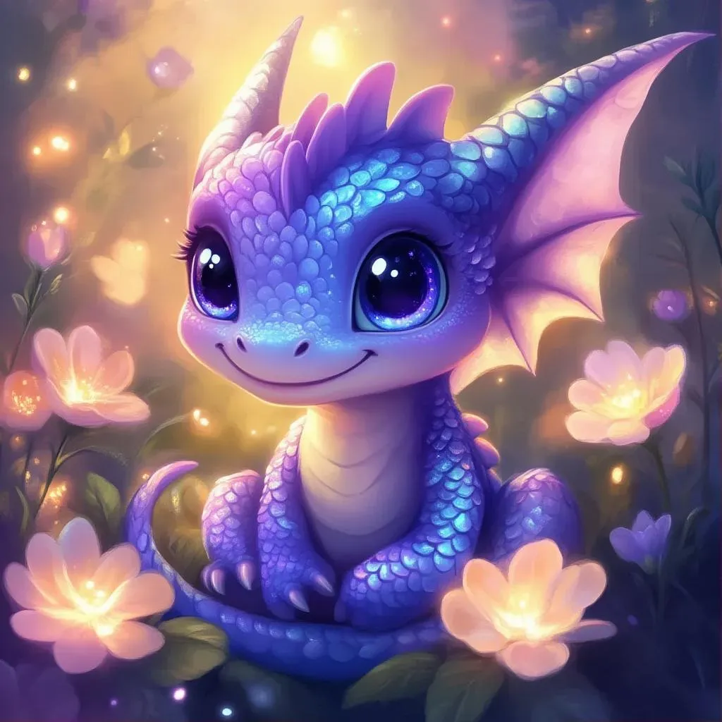 Craft a magical baby dragon with vivid purple-blue scales, glowing expressive eyes, and a cheerful smile amidst enchanted glowing flowers. Vivago.ai transforms text prompts into fantasy art, using AI tools and curated effects for professional-quality, whimsical scenes in captivating settings.