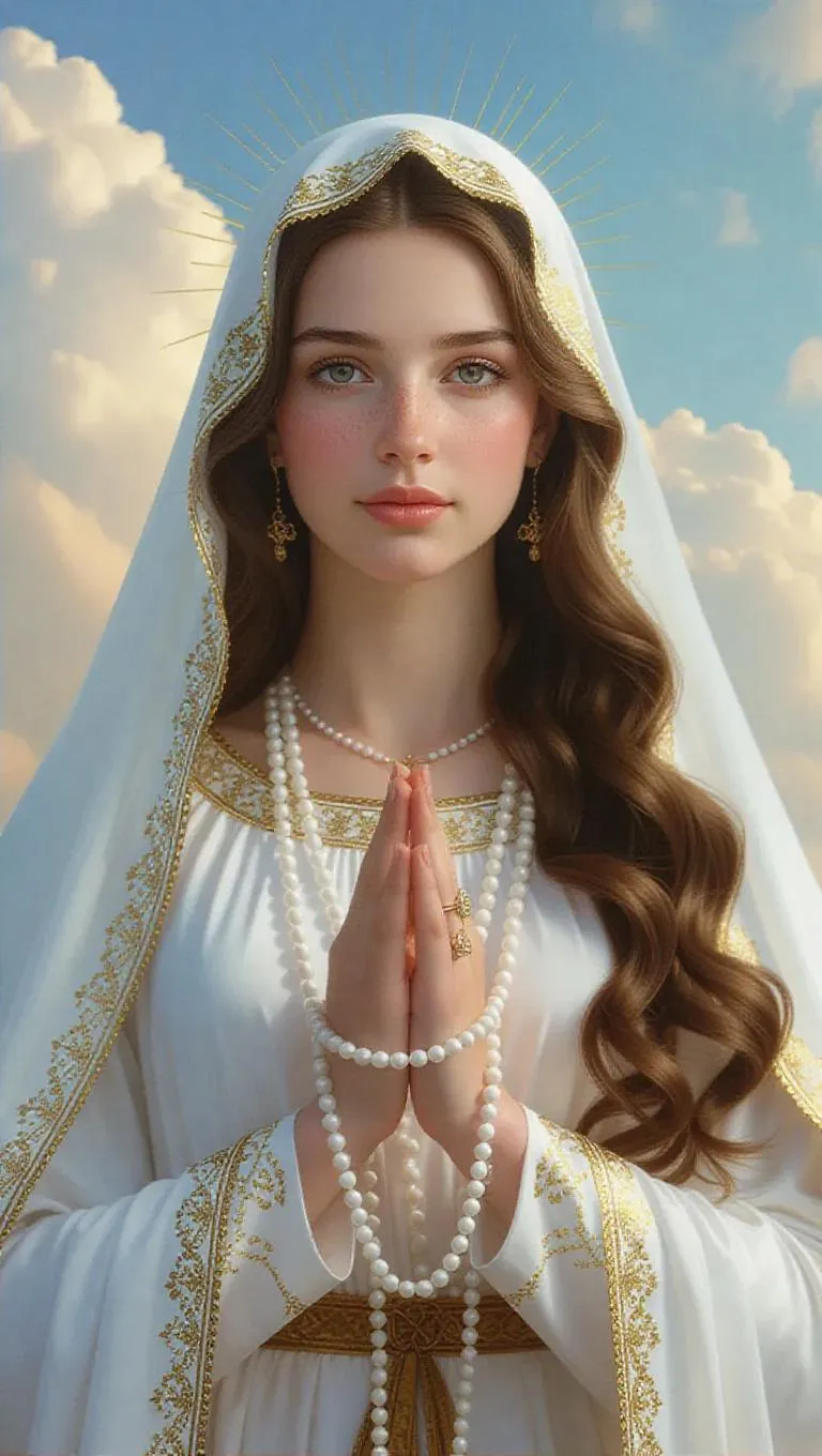 Generate a realistic AI image of the Virgin Mary with brown hair, serene expression, and hands clasped in prayer holding a white rosary. Clad in white-and-gold attire against a celestial sky, radiating divine light. Perfect for faith-inspired artwork, religious content, or AI-generated spiritual visuals. Elevate projects with professional-grade holy imagery via VivaGo's AI tools.