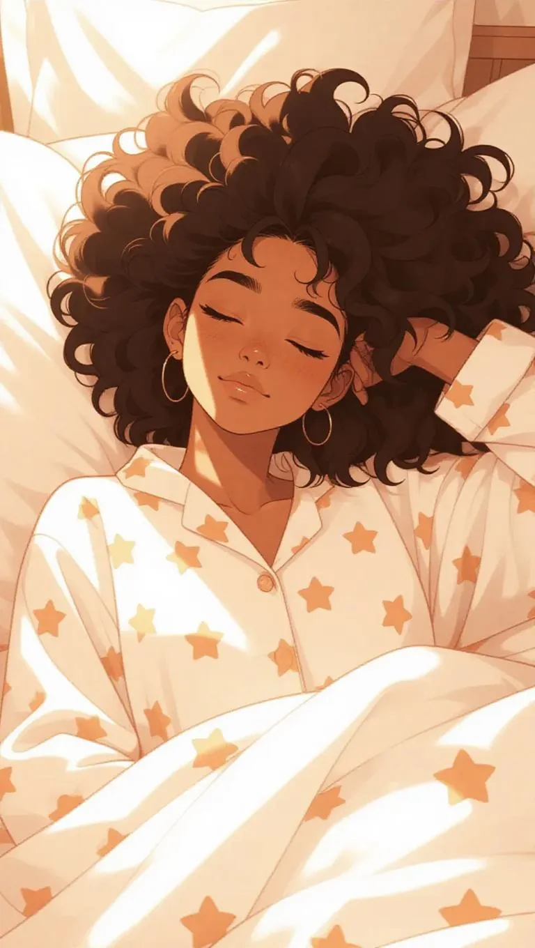 Generate vibrant AI cartoon art of a young Black woman in cozy pajamas, lounging in bed with messy hair & soft morning light. Perfect for Instagram, blending relatable sleepy expressions with professional-grade AI effects from vivago.ai.