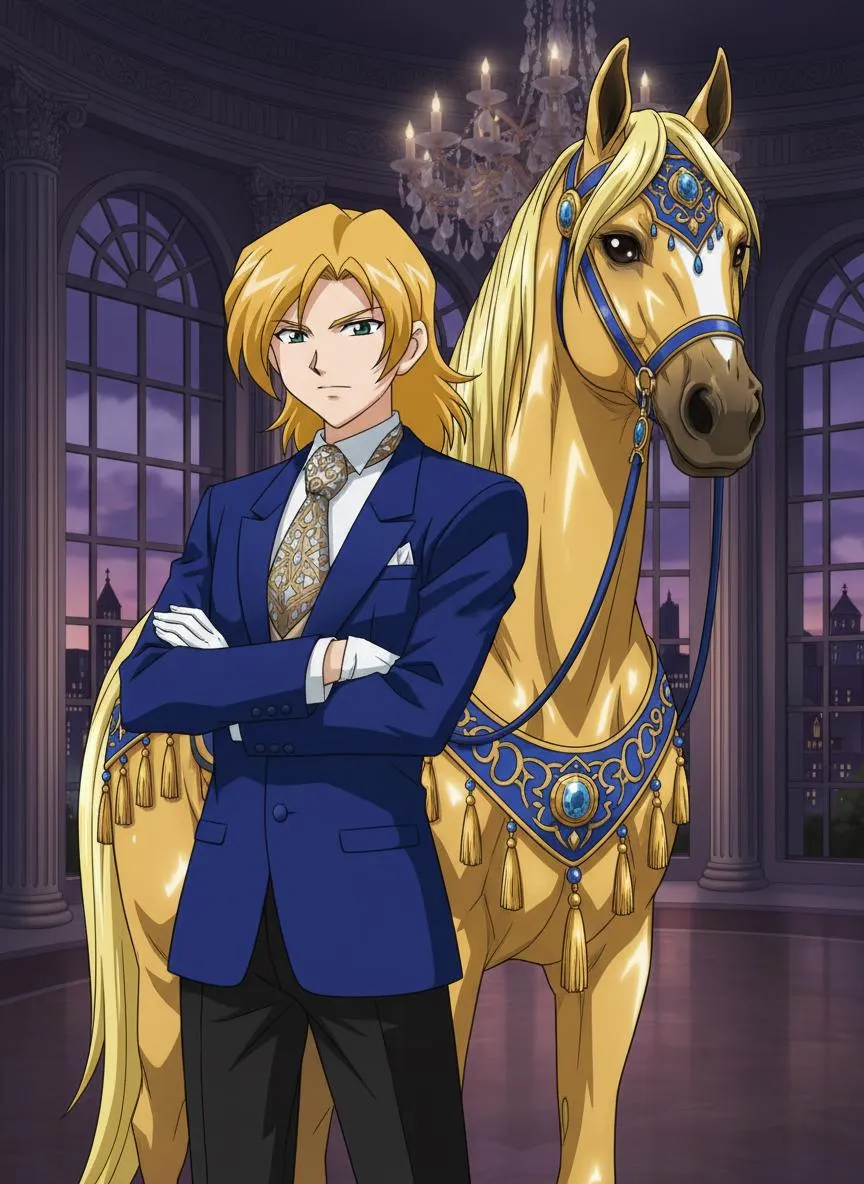 Generate sophisticated images of an elegantly dressed man with a majestic gold Arabian horse using AI. Create stunning visual content with detailed attire and regal equine companion. Perfect for luxury themes.