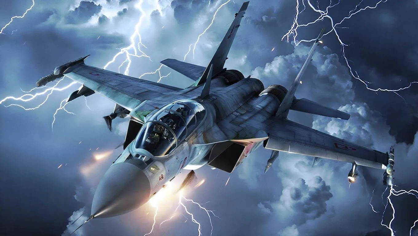 AI-generated image of a majestic SU-30 fighter jet soaring through dynamic stormy skies, vapor trails and lightning accents intensifying the high-octane aviation scene. Sleek silhouette contrasts turbulent clouds, intricate wing details, and a glowing cockpit illuminated against dramatic ambiance. Explore AI-powered creativity for vivid aviation art and professional-grade visual effects.