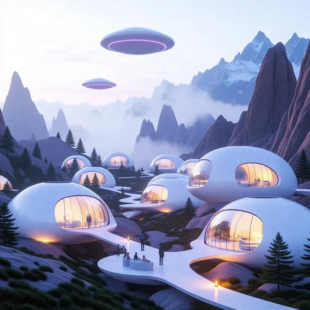 Explore AI-generated futuristic landscapes with domed organic architecture, panoramic windows, and sci-fi flying machines. This serene mountain settlement, enveloped in mist and purple-glowing discs, blends modern interiors with tranquil isolation. Perfect for envisioning innovative habitats, Vivago.ai transforms prompts into vivid, professional-grade visuals.