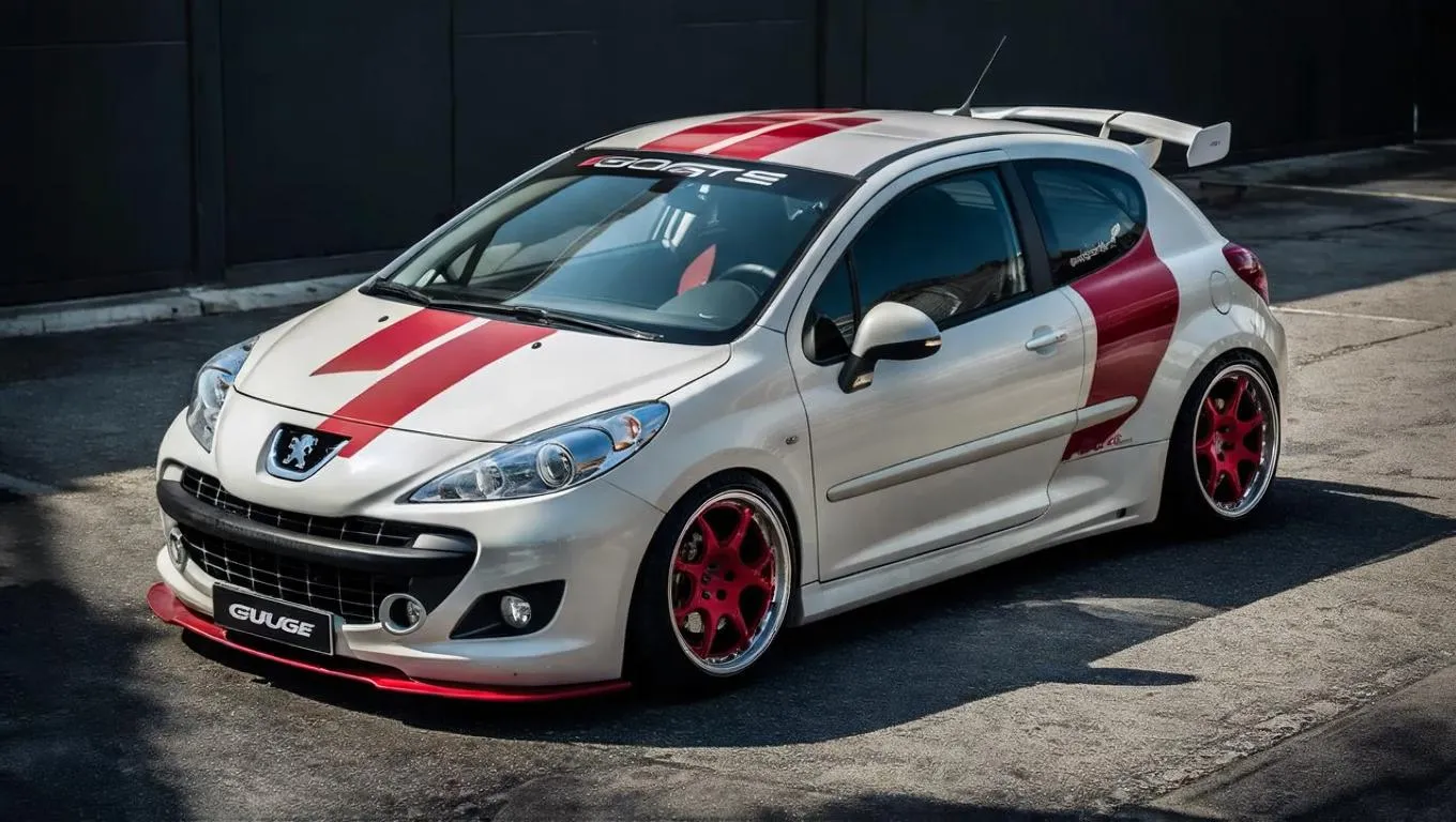 Generate striking automotive visuals with Vivago.ai's AI tools. This high-angle shot showcases a sleek 2006 Peugeot 207 in matte white, accented by bold Chinese Red BBS rims and dynamic hood stripes. Daylight highlights the Ivory White paint's elegance, contrasting with dark surroundings for aggressive yet refined aesthetics. Perfect AI-enhanced car design imagery. #Gouge #ChineseRed #IvoryWhite