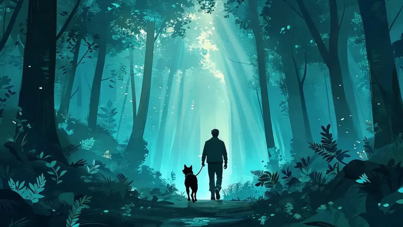 Generate a serene AI image of a man and his dog in a mystical cyan-tinted forest using vivago.ai. Transform text prompts into vivid, dreamy visuals with professional AI effects. Elevate storytelling with ethereal cyan filters and advanced AI editing tools for captivating nature scenes.