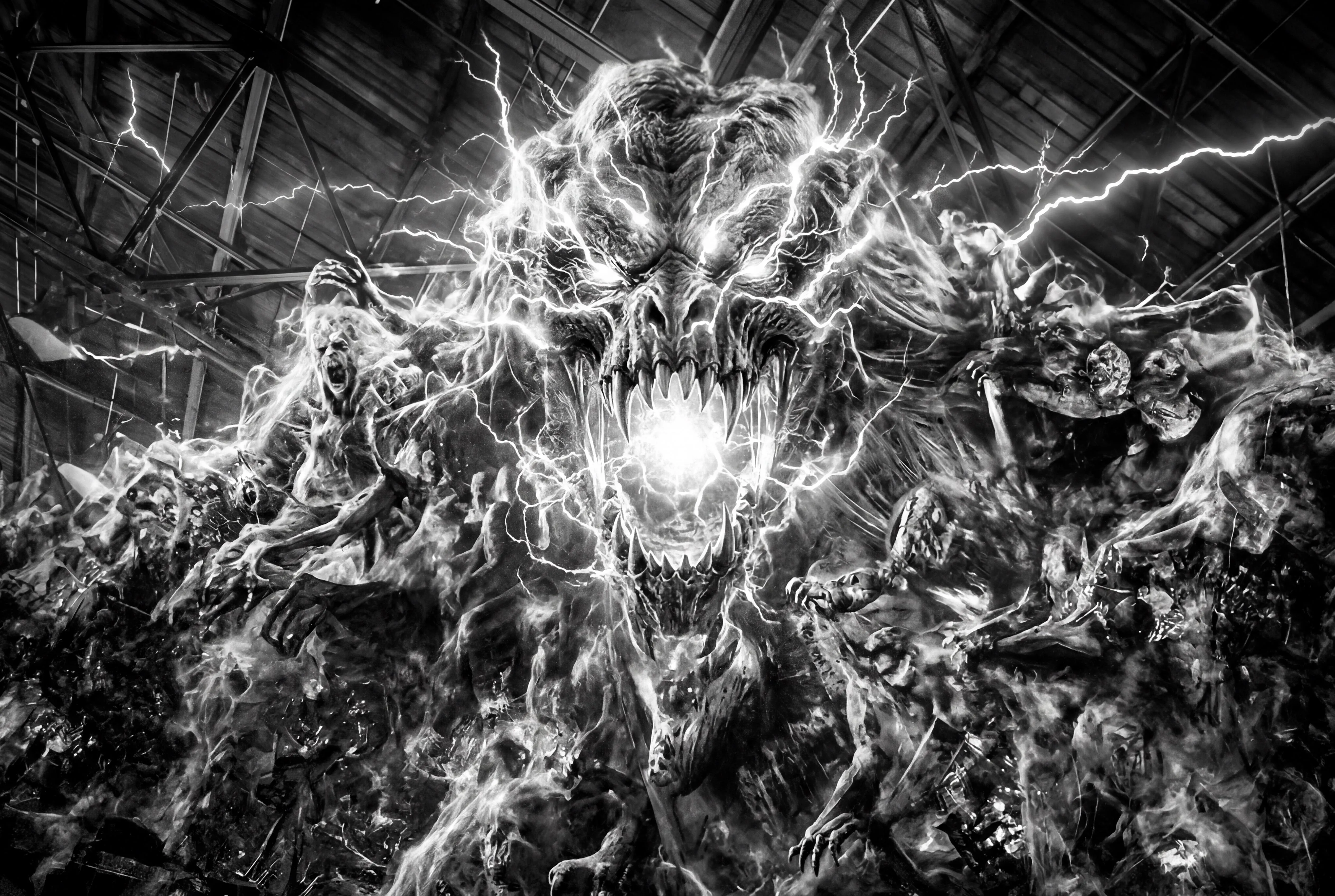 The Zzzax-esque form of Dr. David Banner (portrayed by Nick Nolte) in 2003's Hulk and Parallax (portrayed by Clancy Brown) in 2011's Green Lantern interchangeably combine together into each other as one, facial and physical features alike, to become Parazzzax (no names or Apple computers logo on the bottom right hand corner seen). The entire image is presented in black-and-white. No sensitive information or guidelines violating content are included.