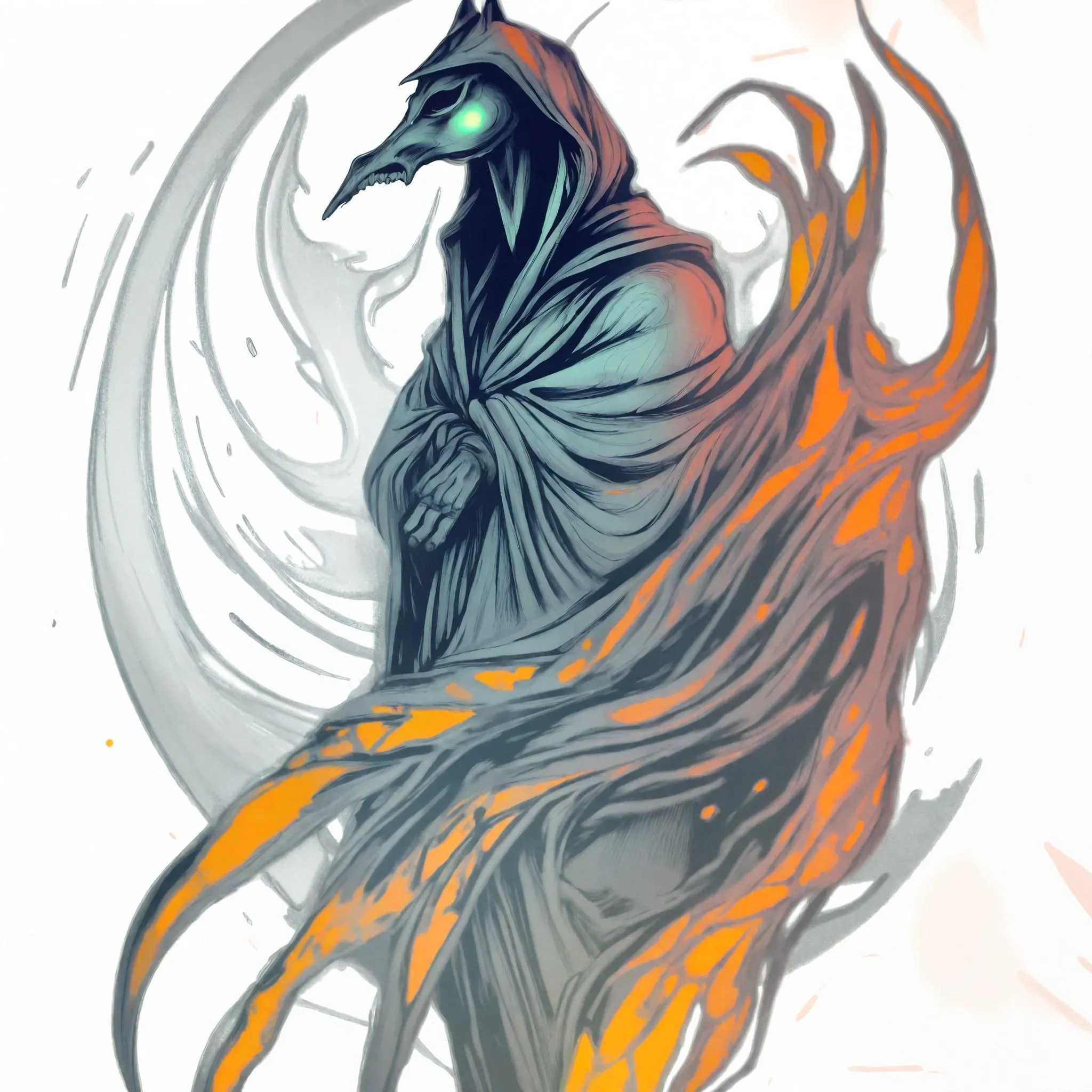 Vibrant Halloween vector art featuring a headless horseman in a hooded shawl with glowing eyes. Bold colors, intense design, and soft-edge styling create striking visuals. AI-generated for professional use, this spooky artwork pops against a clean white background. Perfect for eerie themes and high-impact creative projects.