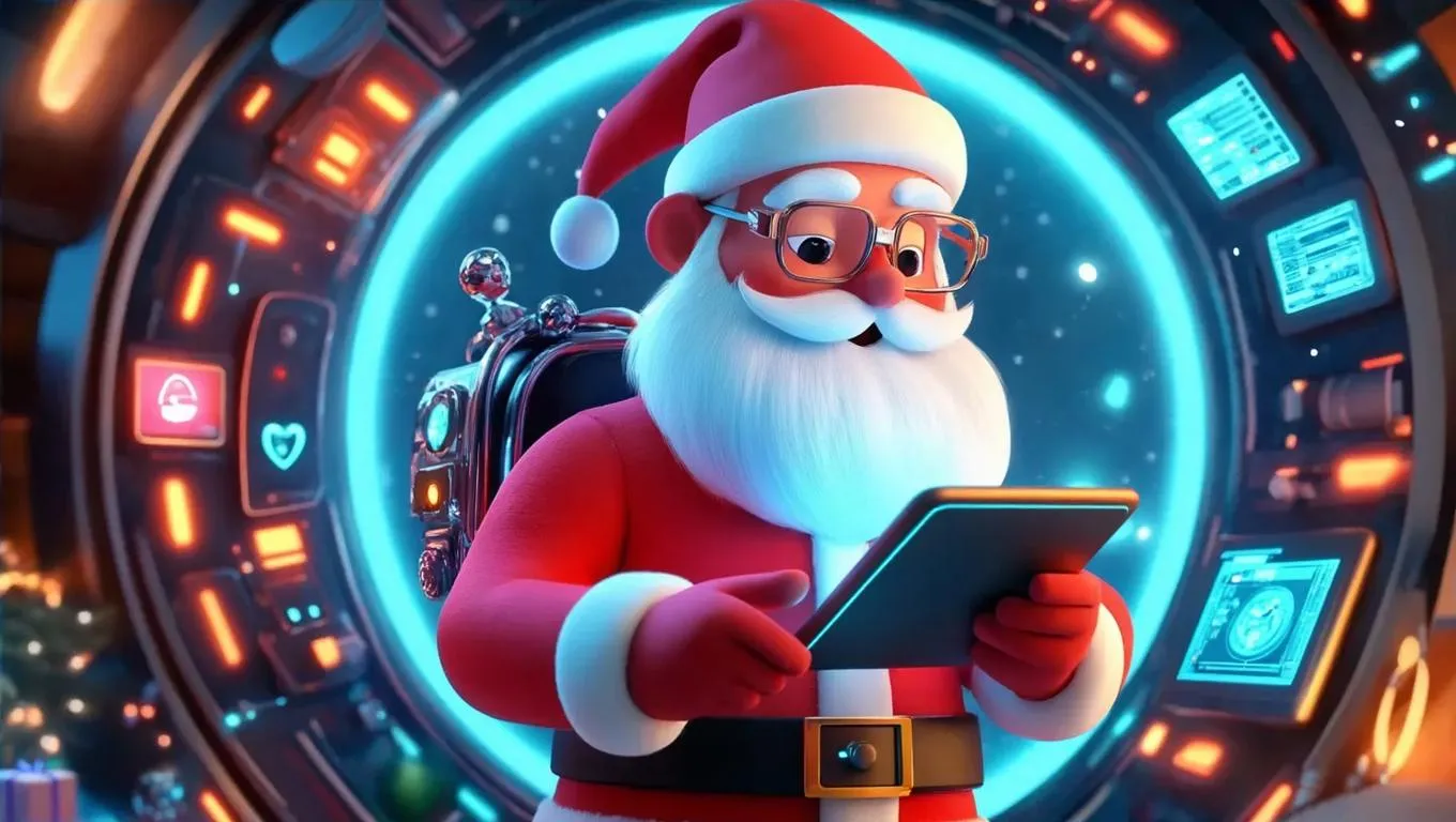 Generate a modern, AI-powered 3D cartoon Santa using a tablet to track his high-tech sleigh route amid digital gadgets. Perfect for festive animations, holiday tech designs, and innovative Christmas visuals. Create dynamic, AI-generated characters with vivago.ai's tools for cutting-edge seasonal content.