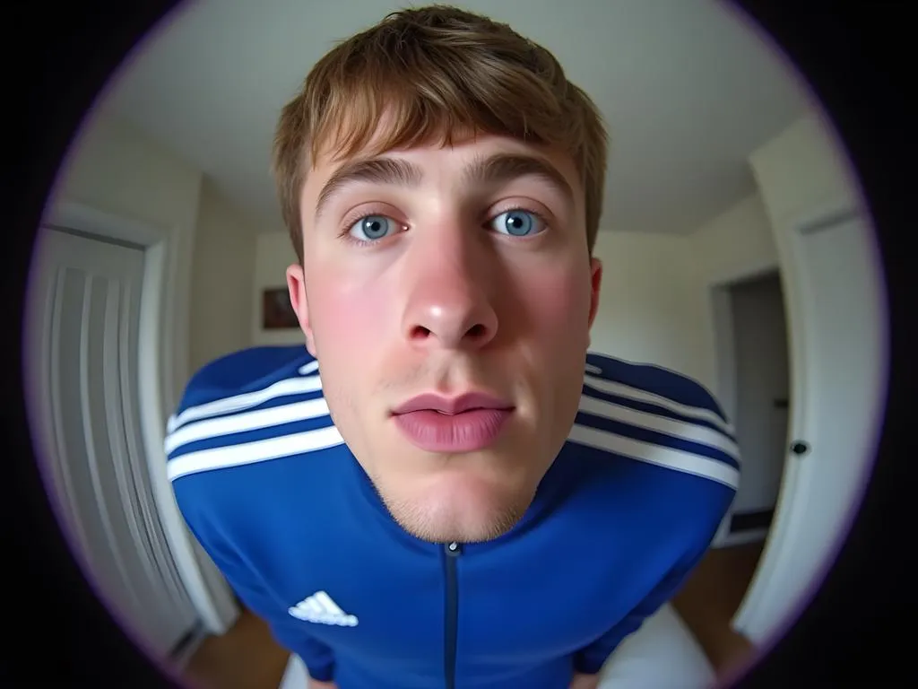 Transform text into AI-generated visuals with Vivago.ai's extreme close-up POV effect. Experience a dramatic upward perspective in a dark bedroom setting, featuring a towering figure in a blue Adidas tracksuit, intense blue eyes, and puckered lips. Perfect for #GiantKiss, #FisheyeLens, and #UpView scenes—craft striking, immersive visuals with professional AI tools.