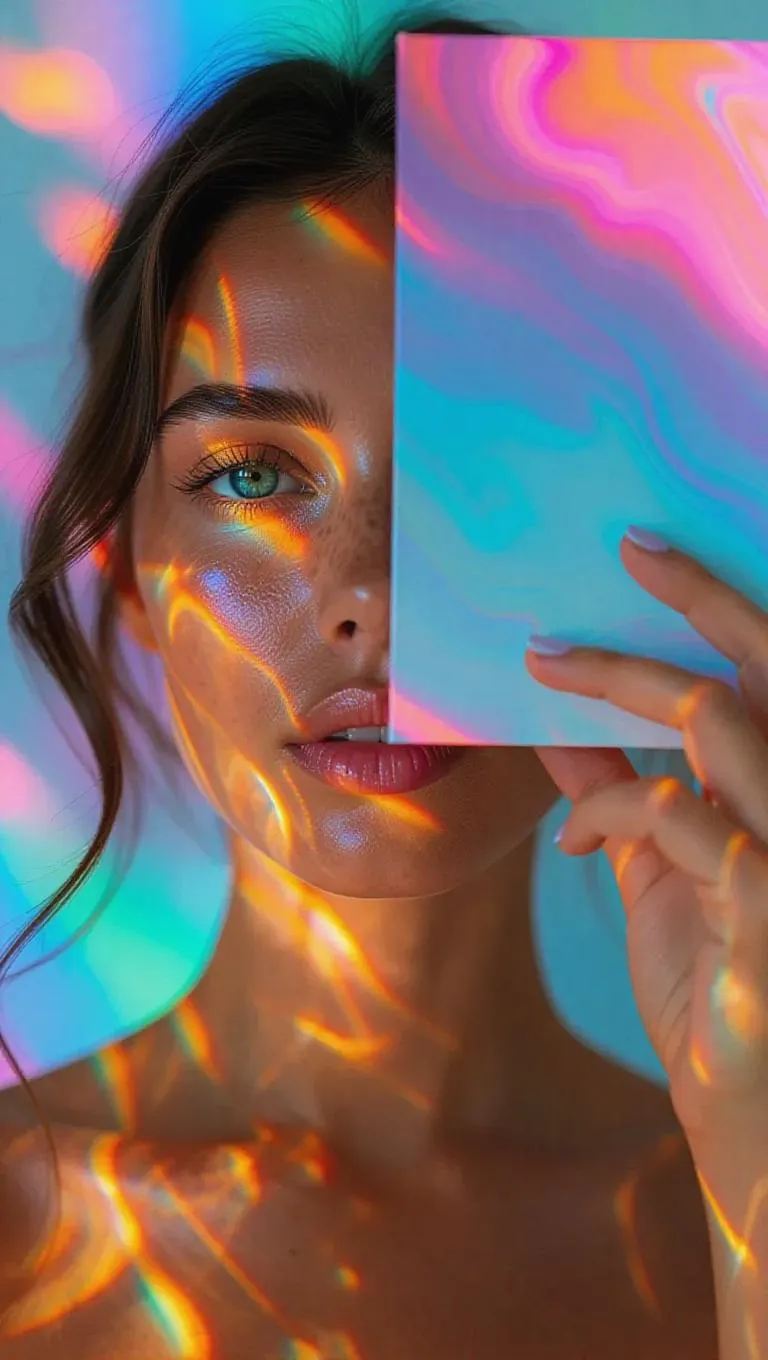 Create stunning AI-generated portraits with vivago.ai. Transform prompts into captivating visuals: a flawless woman holding an abstract painting obscuring half her face, set against a fluid artistic backdrop. Perfect for digital art, marketing, or creative projects. Elevate your visuals with AI-powered precision and professional-grade effects.
