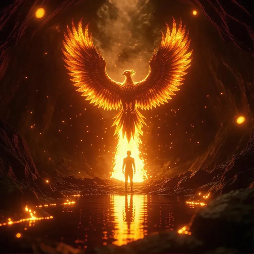 Ignite your creativity with this AI-generated cinematic scene of fiery rebirth. A molten-gold energy Phoenix emerges from volcanic flames, symbolizing transformation. Detailed volcanic caverns, swirling embers, and glowing reflections capture fantastical artistry. Perfect for fantasy visuals, cinematic storytelling, and symbolic AI-powered imagery blending fantasy, fire elements, and rebirth themes in vivid, warm-hued detail.
