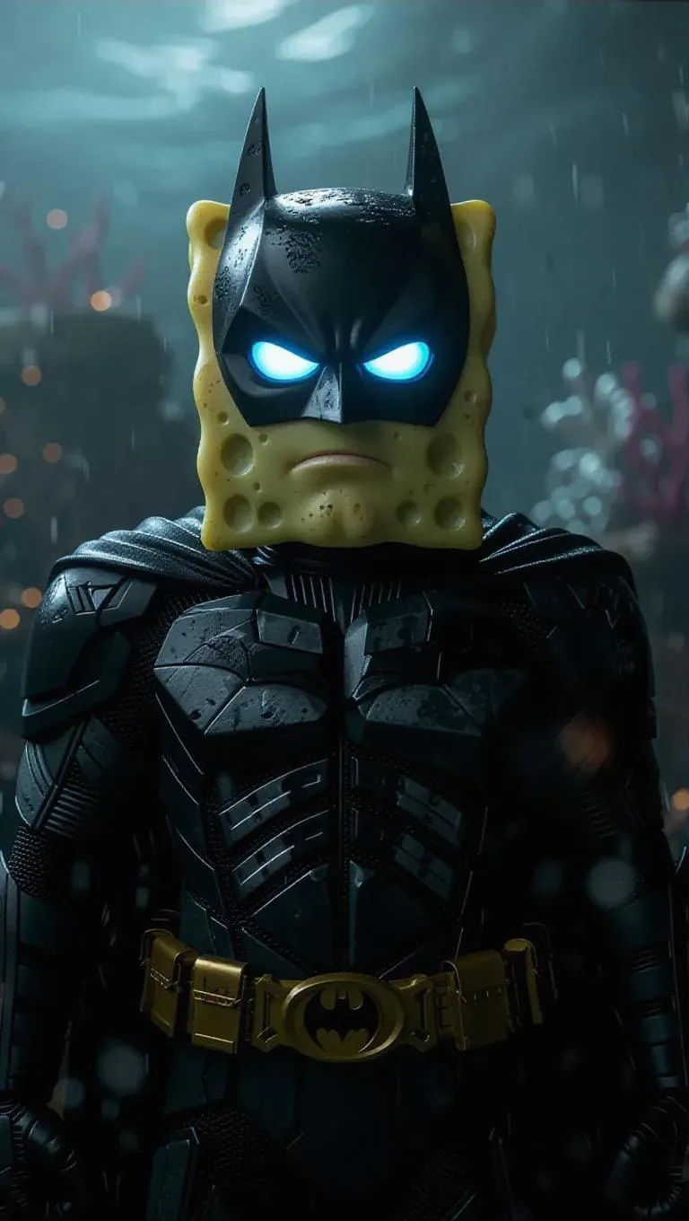 Generate AI art of SpongeBob as Batman in dark armor with angular design, glowing bat symbol, and stormy ocean backdrop. Perfect for heroic, mysterious visuals. Create professional-grade AI images with VivaGo.ai’s text-to-image tools and editing effects. Ideal for unique character mashups and dramatic, high-contrast scenes.