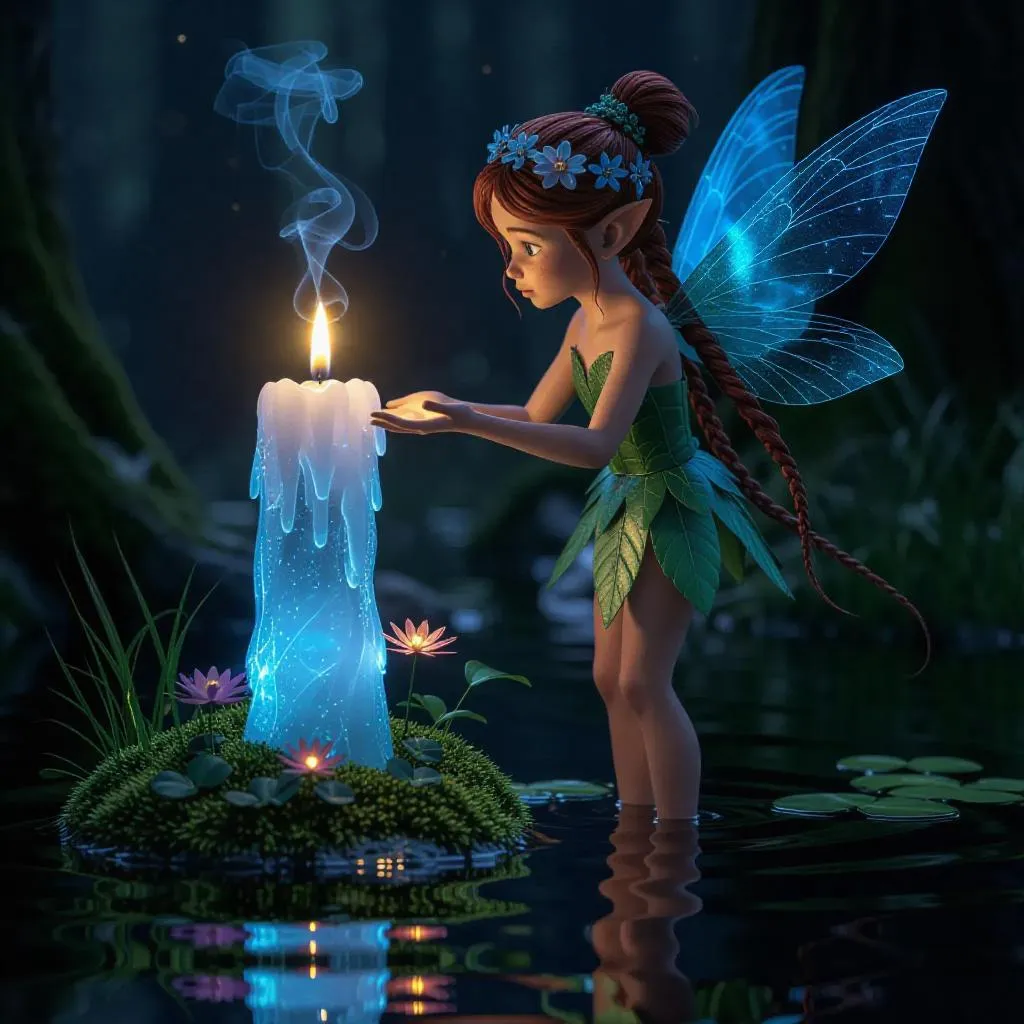 Discover AI-generated enchantment with this photorealistic 3D scene: a forest fairy adorned with floral braids and dragonfly-inspired wings interacts with a mystical ice-crystal candle. Glowing particles, ethereal smoke, and mossy surroundings amplify the magical ambiance. Perfect for fantasy art seekers exploring AI image generation, hyper-detailed character design, and ethereal lighting effects in mystical environments.
