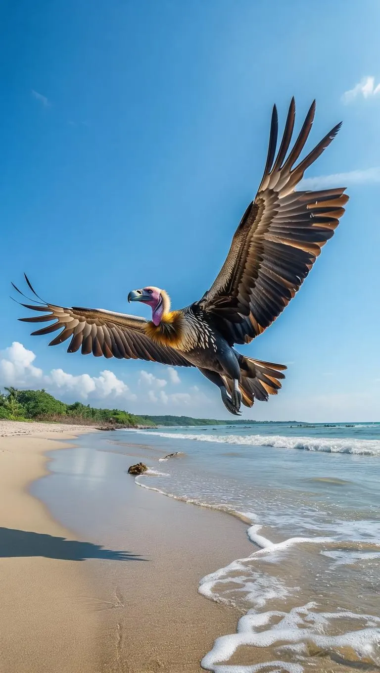 Transform your vision into a striking AI-generated image of a majestic vulture soaring over golden beaches. Capture dynamic coastal wildlife scenes with ultra-realistic motion, intricate details, and dramatic skies. Ideal for nature photography, digital art, and content creators seeking breathtaking avian imagery in serene seaside environments. Elevate your projects with high-resolution, AI-powered creativity.
