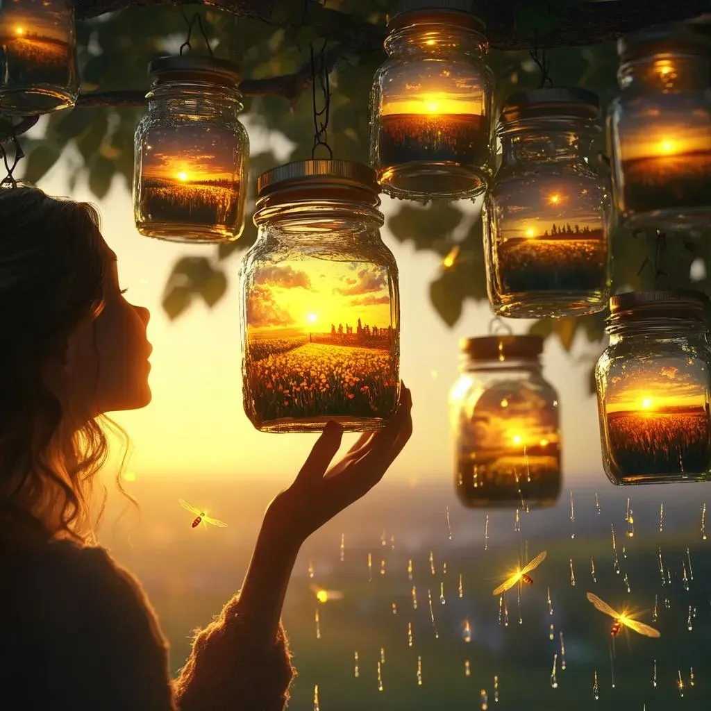 Discover AI-generated anime watercolor art blending cinematic magic. A traveler unlocks a glowing jar, releasing golden light and fireflies amid miniature sunset scenes. Close-up lens flare highlights this ethereal watercolor moment. Create dreamy, cinematic visuals with Vivago.ai's AI image generation tools for anime-style, artistic storytelling in 1:1 aspect ratio. Perfect for fantasy scenes, ethereal effects, and whimsical storytelling.