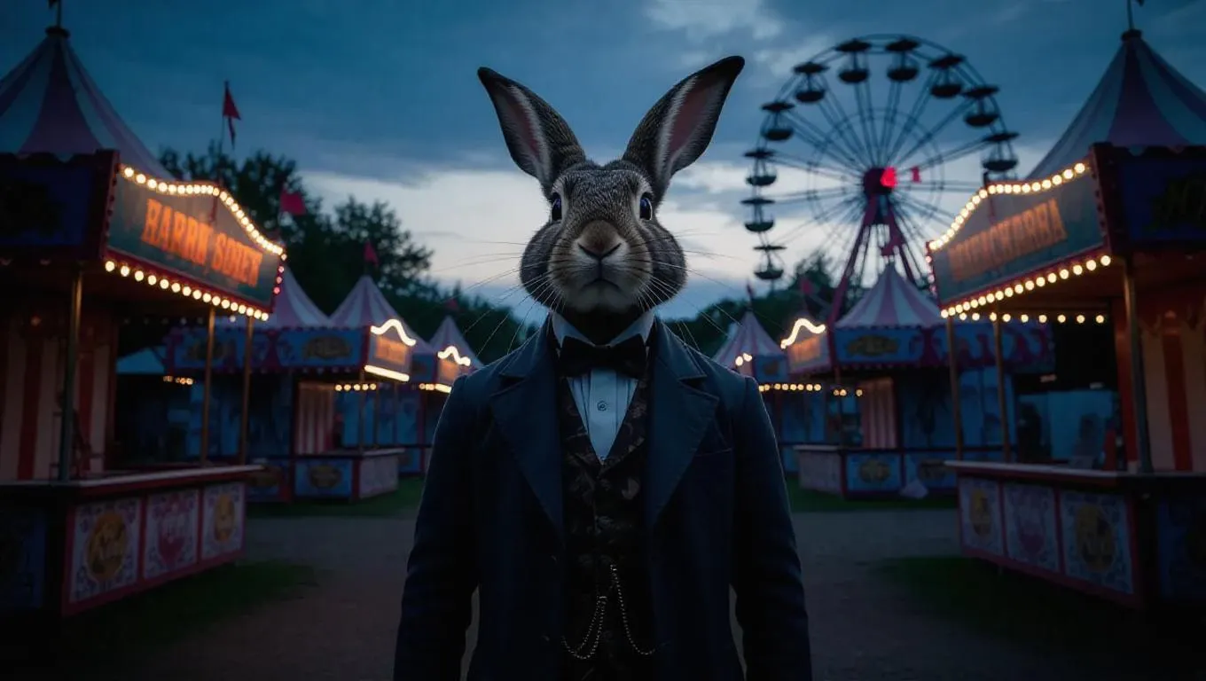 A low-angle, slow-motion dolly shot of a lone figure standing in the center of a dimly lit, eerie carnival at dusk, the only sound being the distant, haunting calliope music. The man, dressed in a worn, 19th-century three-piece suit, has a rabbit's head, with long, silky whiskers and glassy, black eyes that seem to hold a deep sadness. His ears, long and perked, twitch slightly as he gazes upwards, lost in thought. In the background, dilapidated booths and rickety Ferris wheels loom, shrouded in mist, while the air is thick with the sweet scent of funnel cakes and the promise of forgotten dreams. The camera glides closer, the man's rabbit features illuminated by the faint, golden light of a lone, flickering lantern, as if spotlighting a forgotten mythical creature in a world that's left him behind.