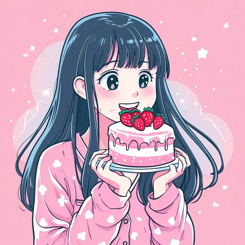 Create a whimsical anime-inspired scene with a cute girl in pink pajamas holding a strawberry cake, set in a dreamy Japanese manga-style backdrop. AI-generated art captures joyful expressions, sparkling eyes, and soft blue tones for a vibrant, playful vibe. Perfect for fans of AI effects and anime visuals.
